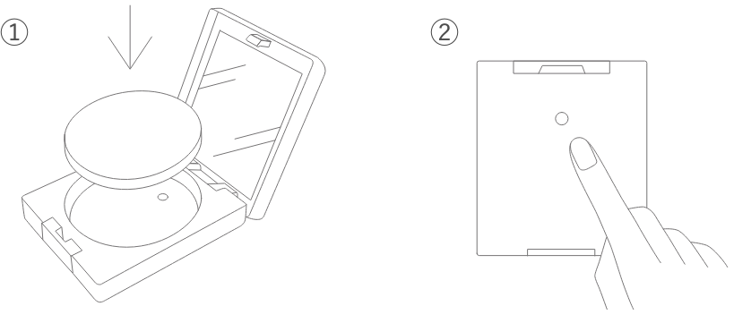 中皿を図@のようにケースのくぼみにセットした後、パフなどで上から軽く押さえます。このとき、シールを指などでさわったり、ケースの接着面にパウダーが付着していると、中皿がケースに接着しにくくなります。また、パウダーの表面に指や爪が触れないようにご注意ください。